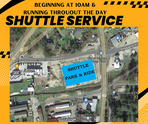 You can park and ride to the festival if parking is full in the lots adjacent to Broadway. The shuttle pick up is in the vacant lot situated between Smokin' J's BBQ and 159 coming into Minden. See map below for reference.